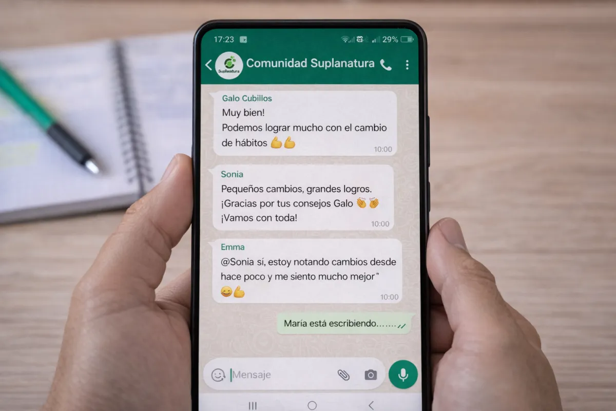 Al entrar, accedes a la comunidad en WhatsApp moderado por Galo Cubillos y su equipo especializado. Allí puedes hacer tus preguntas, compartir avances, ver recetas y recibir apoyo durante el proceso.
